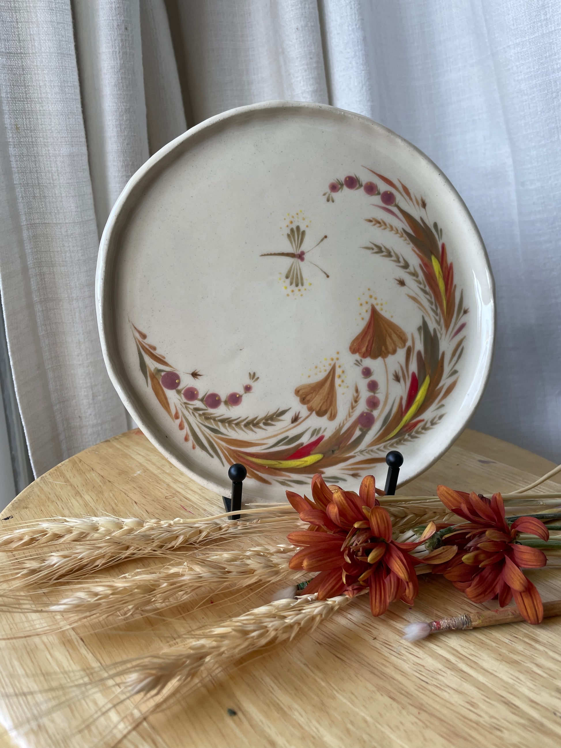 Hand painted ceramic plate Mushrooms and Dragonfly