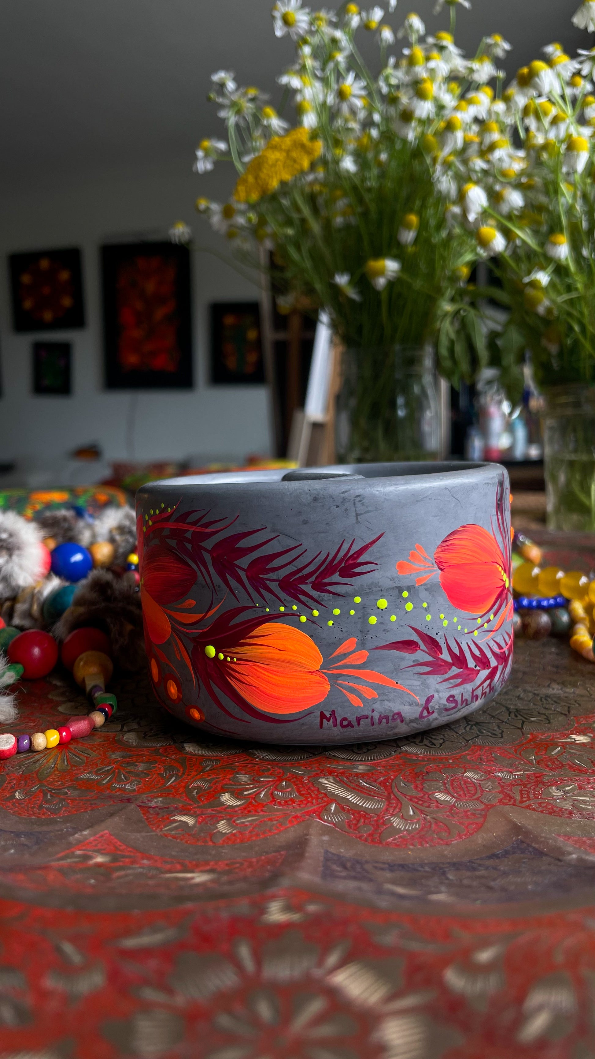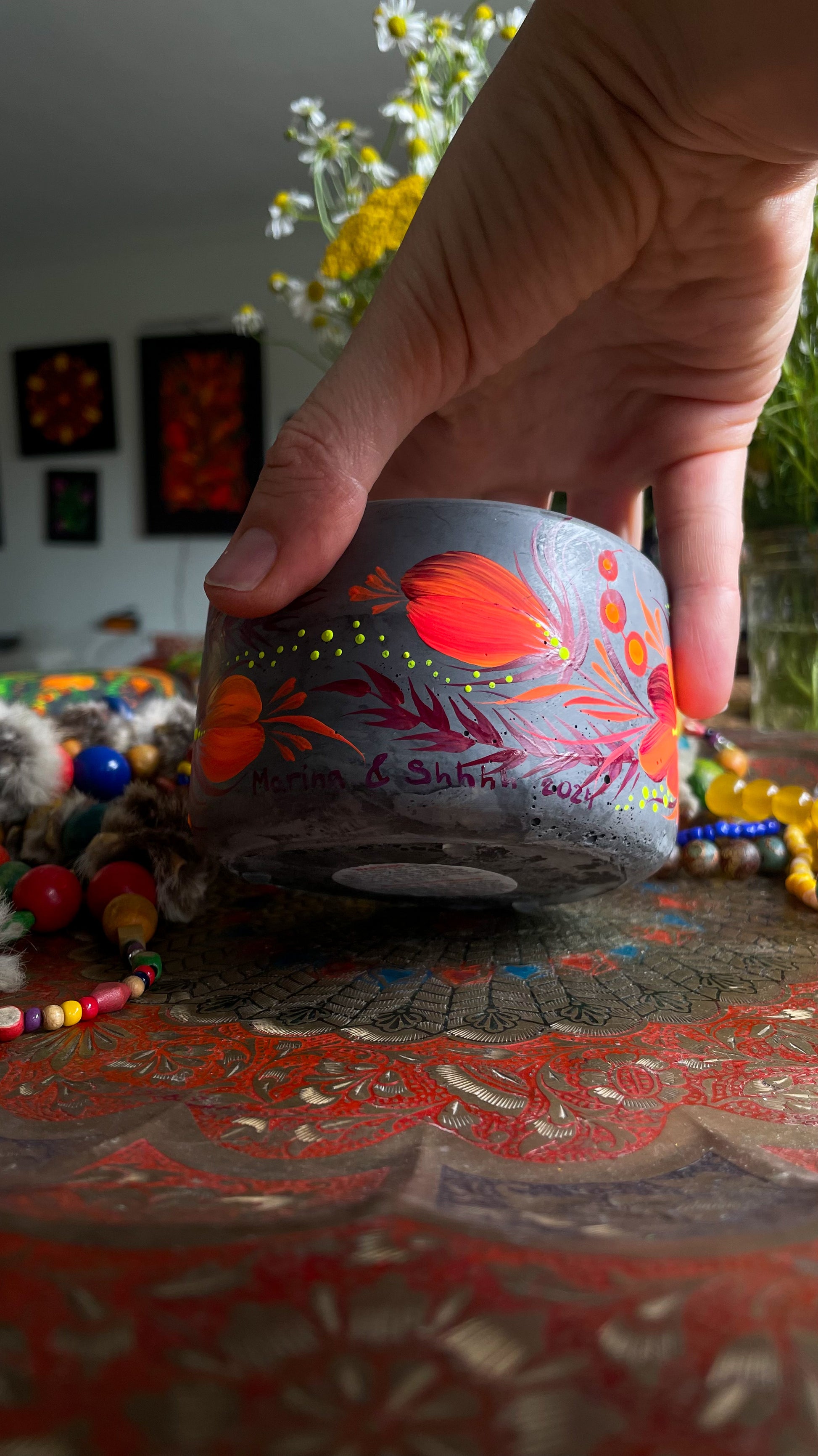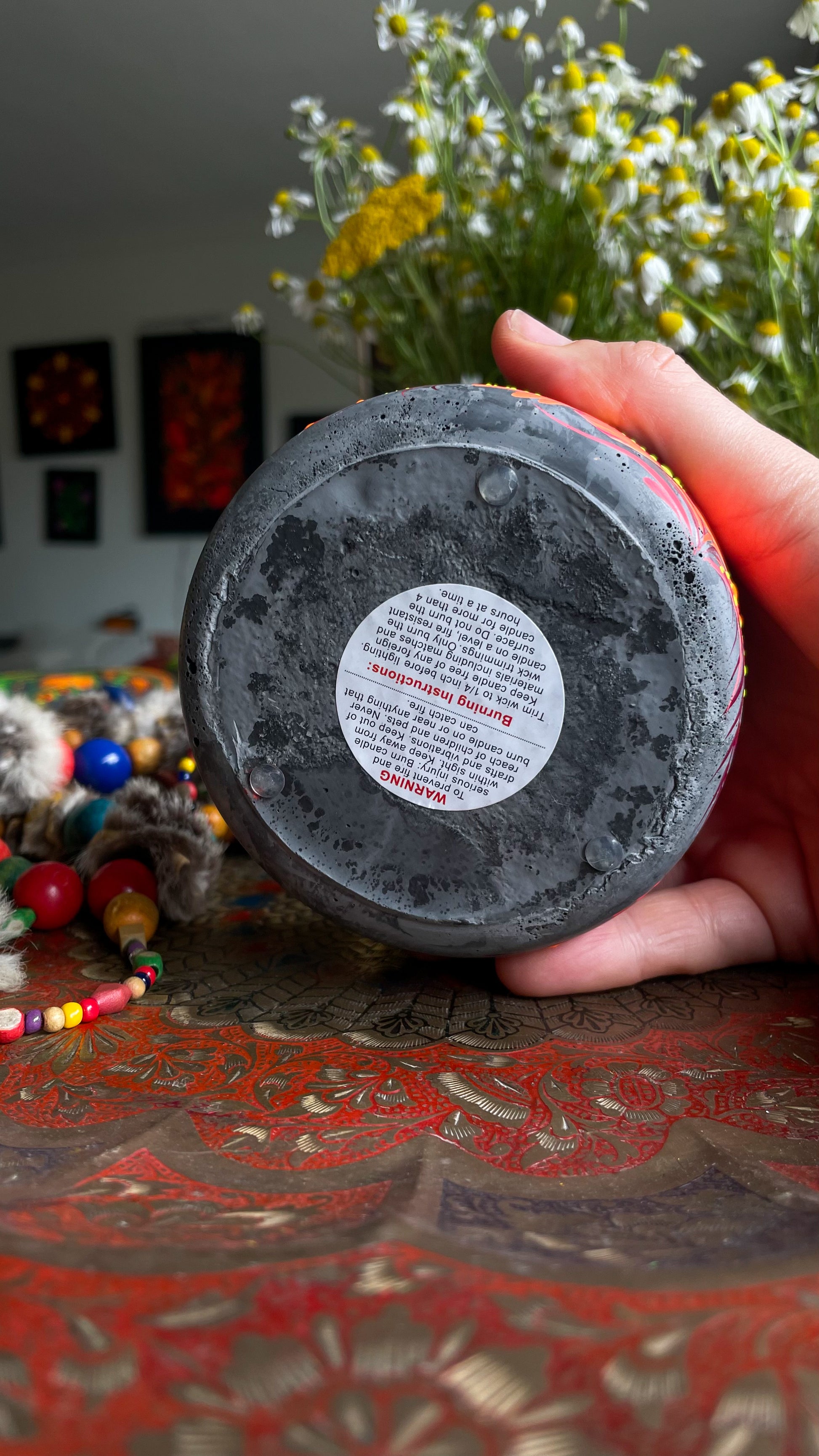 Candle, hand-painted by artist Marina Malyarenko, boasts a unique design that adds an artistic touch to any space. Made with care by Shhhh candles by Kat, these candles feature concrete containers and soy wax for a sustainable and eco-friendly option.