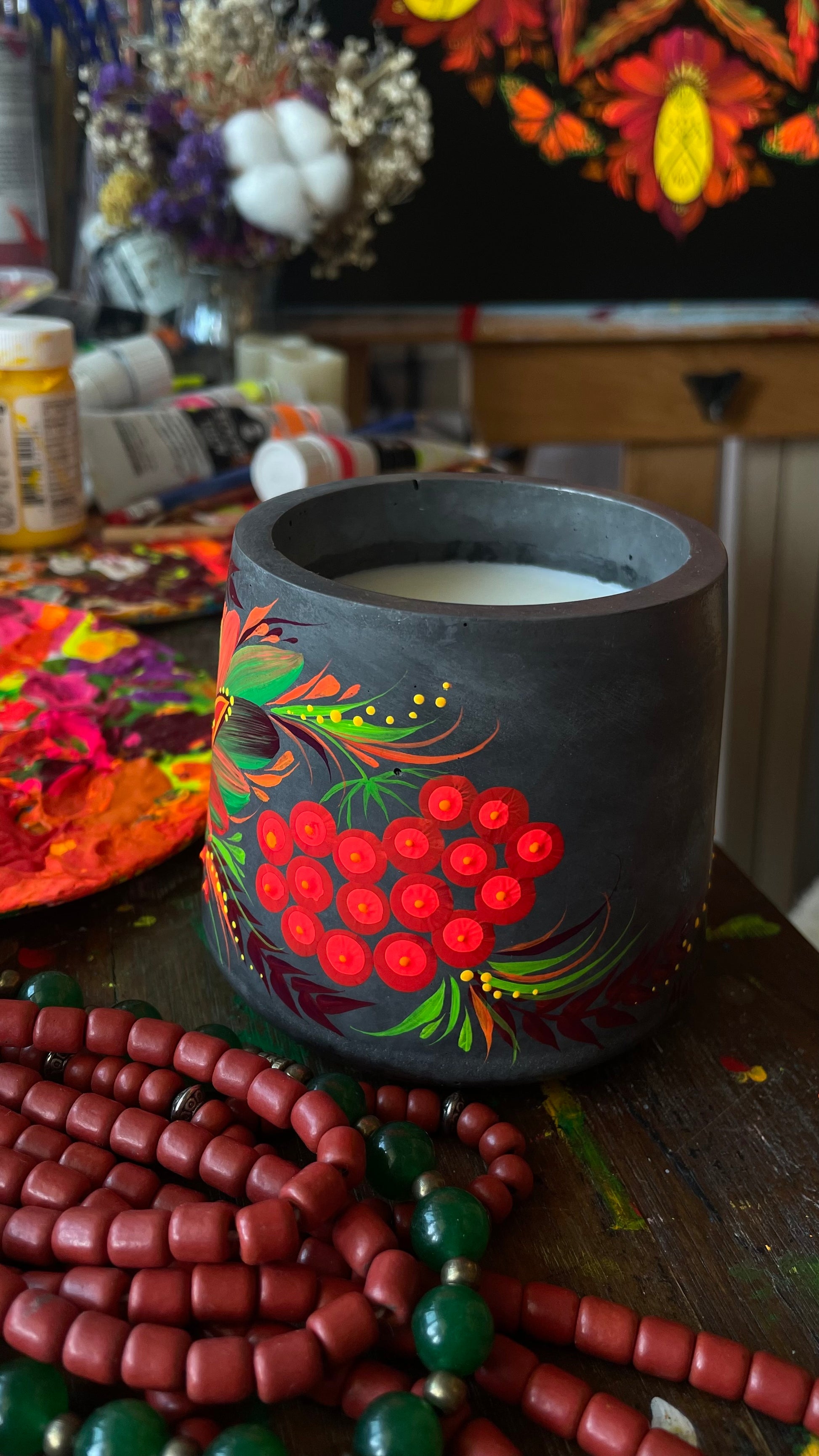 Candle, hand-painted by artist Marina Malyarenko, boasts a unique design that adds an artistic touch to any space. Made with care by Shhhh candles by Kat, these candles feature concrete containers and soy wax for a sustainable and eco-friendly option.