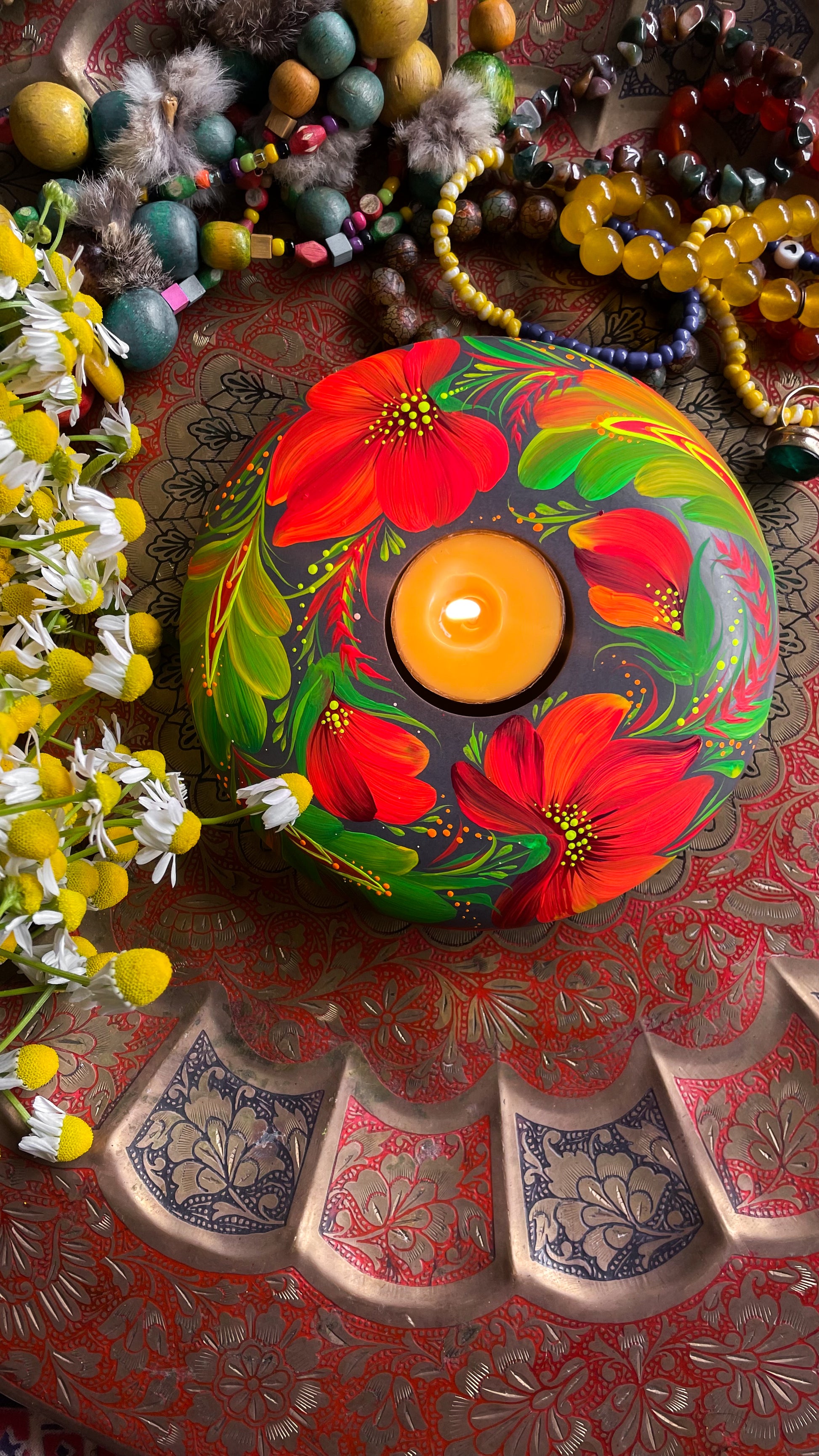 Candle, hand-painted by artist Marina Malyarenko, boasts a unique design that adds an artistic touch to any space. Concrete container hold standard size tea light candle made of bee wax or soy wax(your choice), extra tea light candles will be added to your order.