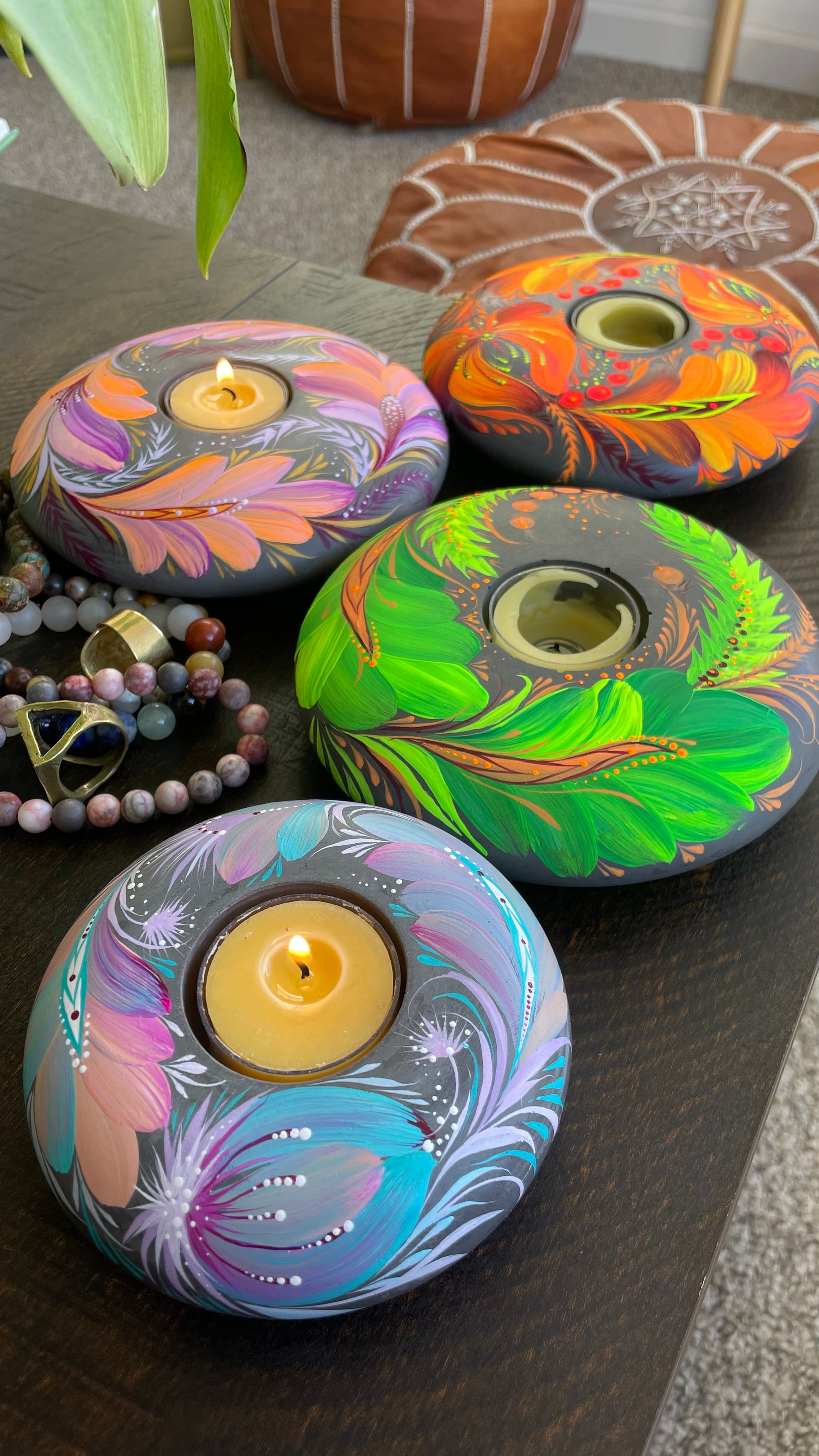 Candle, hand-painted by artist Marina Malyarenko, boasts a unique design that adds an artistic touch to any space. Concrete container hold standard size tea light candle made of bee wax or soy wax(your choice), extra tea light candles will be added to your order.