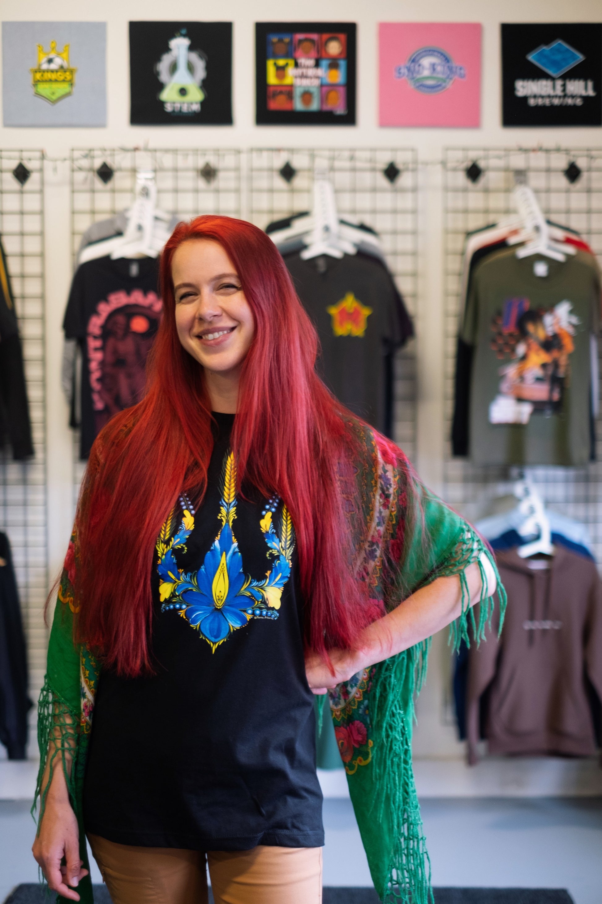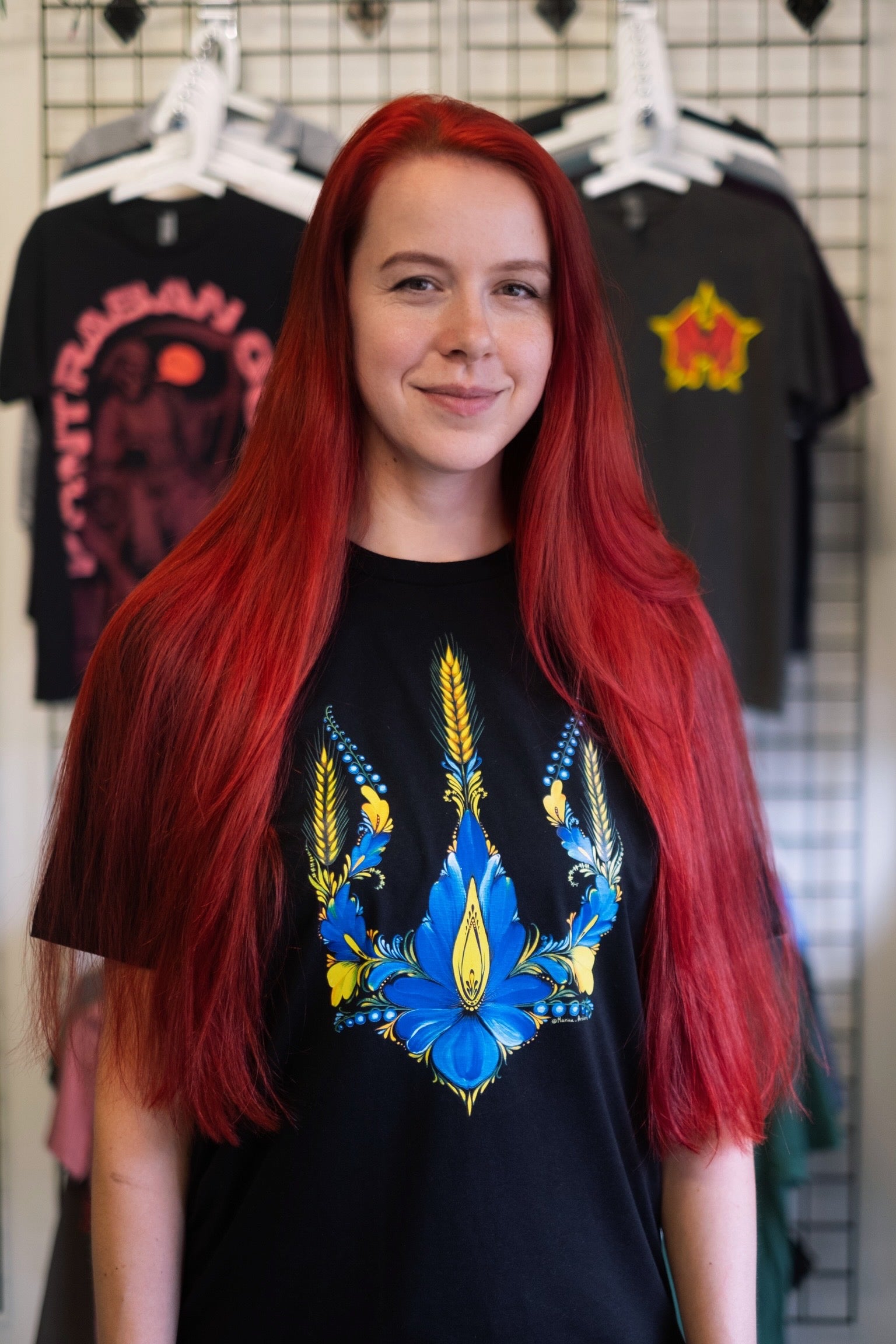 T shirts with custom print of painting Tryzub by artist Marina Malyarenko.